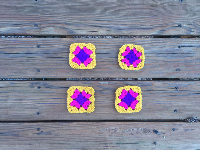 As I was working on the square, I noticed that it seemed very tidy (and firm) as compared to the granny squares I have crocheted, and at my mother’s suggestion, I decided to do a bit of test run on different sets of directions to see what the variations looked and felt like.